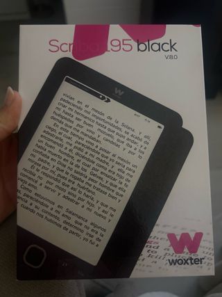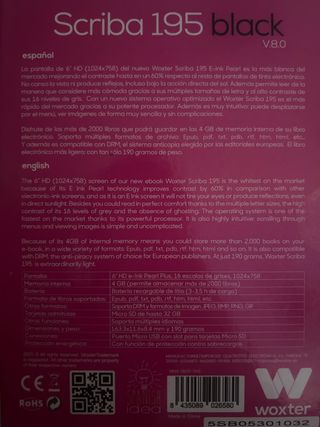 Ebook Woxter Scriba 195 en color negro. Pantalla de 6 HD. - Pantalla: 6 HD e-Ink Pearl Plus, 16 escalas de grises, 1024x758. - Memoria interna: 4 GB (permite almacenar más de 2000 libros). - Batería: Recargable de litio (3-3,5 h de carga). - Formatos soportados: Epub, pdf, txt, pdb, rtf, htm, html, etc. - Otros formatos: Soporta DRM y formatos de imagen JPEG, BMP, PNG, GIF. - Tarjetas admitidas: Micro SD de hasta 32 GB. - Dimensiones y peso: 163.3x11.6x8.4 mm y 190 gramos. - Conexiones: Puerto Micro USB con slot para tarjetas Micro SD. - Protección energética: Con función de protección contra sobrecargas.
