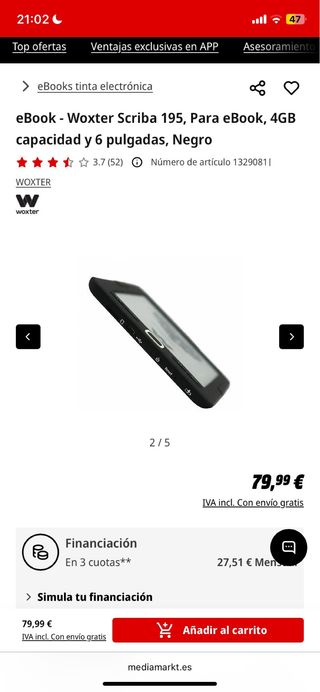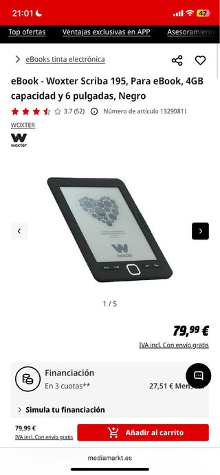 Ebook Woxter Scriba 195 en color negro nuevo sin abrir, sigue con el precinto - Pantalla de 6 pulgadas. - Capacidad de 4GB.