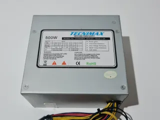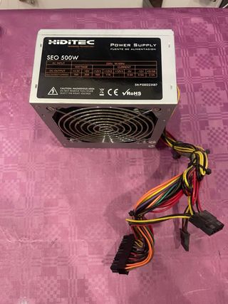 Fuente de alimentación TECNIMAX para PC de 500W, en perfecto estado, tal como se ven en las fotos. - Modelo: HTFA500S ATX12V +5Vsb:1.5A - Protección contra sobrecarga. - Protección contra sobretensión. - Protección contra cortocircuitos. - Bajo ruido. Se vede y se entrega en mano en Madrid y tambien se hacen Envios por Wallapop. No Negociable.
