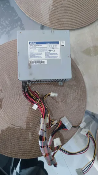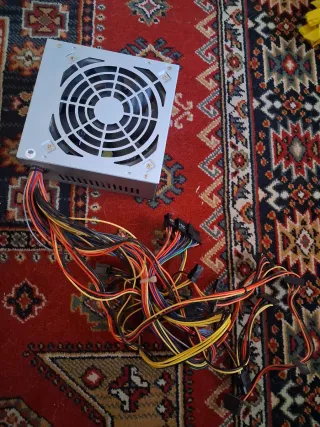 Fuente de alimentación para PC, modelo ATX. - Carcasa metálica gris. - Cables de conexión incluidos. - Etiquetas de control de calidad visibles. 📍 Entrega en mano Madrid ❌ No acepto devoluciones 📸 Hago fotos y videos de la fuente de alimentacion minutos antes de entregarla para verificar su buen funcionamiento.