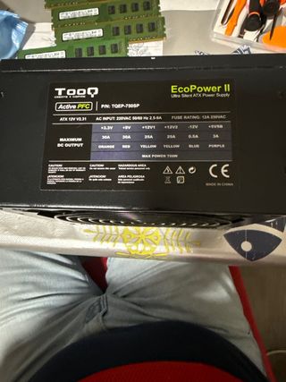 Fuente de alimentación ATX de 750W. - Modelo: EcoPower II TQEP-750SP - Certificación Active PFC - Voltaje de entrada AC: 220VAC 50/60 Hz 2.5-9A - Potencia máxima: 750W - Salidas DC: +3.3V (30A), +5V (30A), +12V1 (25A), +12V2 (25A), -12V (0.5A), +5VSB (3A) - Color de cables: Naranja, Rojo, Amarillo, Azul, Púrpura - Fabricada en China