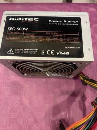 Fuente de alimentación HIDITEC SEO 500W. - Potencia de 500W. - Voltaje de entrada AC 230V, 50-60Hz. - Salidas DC: +3.3V, +5V, +12V1, +12V2, +12V3, -5V, -12V, +5VSB. - Corriente máxima de salida combinada: 18A (+3.3V), 20A (+5V), 16A (+12V1), 17A (+12V2), 0.5A (+12V3), 0.5A (-5V), 2.0A (+5VSB). - Cumple con RoHS.