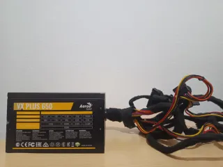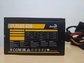 Fuente de alimentación Aero Cool VX Plus 650W. - Potencia: 650W - Voltajes: +3.3V, +5V, +12V, -12V, +5Vsb - Corrientes: 20A, 17A, 50A, 0.3A, 2.5A - Potencias: 120W, 600W, 3.6W, 12.5W - Certificación: CE, FCC, EAC