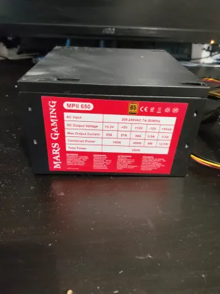 Fuente de alimentación Talius 600w ha sido reparada y puede hacer mal contacto - Voltaje de entrada AC: 115V / 230V. - Frecuencia: 50-60Hz. - Salidas DC: +3.3V (25A), +12V (16A), -12V (1A), -5V, +5Vsb (3A).