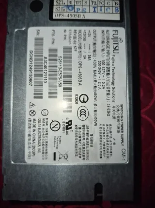 Fuente de alimentación para servidor Fujitsu. - Modelo: DPS-450SB A - Tipo: Switching Power Supply CM-1 - Entrada automática de rango: 100-127V~/5.2A, 200-240V/2.5A - Salida: 450W MAX - Fabricado por Delta Electronics, Inc.