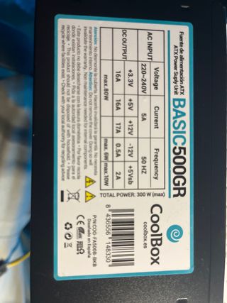 Fuente de alimentación ATX para PC. - Modelo: BASIC500GR - Potencia total: 300 W (max) - Voltaje de entrada: 220-240V - Frecuencia: 50 Hz - Diseñado en España
