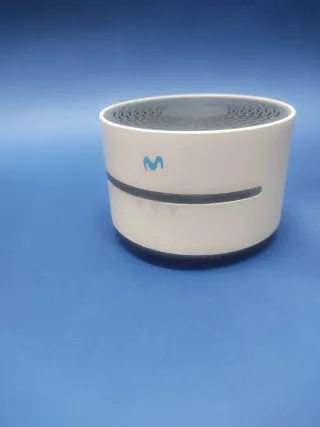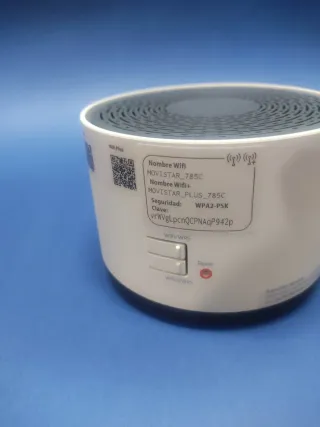 Repetidor de señal wifi 5 de Movistar. - Diseño cilíndrico blanco. - Rejilla superior para ventilación. - Banda decorativa central. - Indicadores luminosos en la parte frontal. - Incluye fuente de alimentación y cable de red.