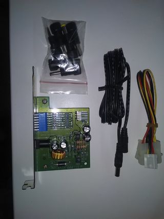 Alimentador de CC. Se pone dentro del PC como si fuese una tarjeta y se alimenta desde la fuente del PC. Dispone de varios conectores CC y se puede seleccionar 3.3 4.5 5 6 7.5 9 y 12v de salida con una corriente de hasta 4A. Varias unidades disponibles