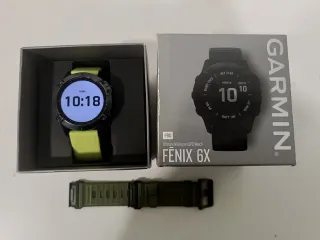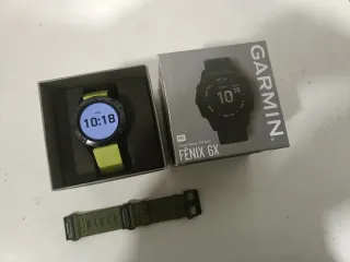Reloj deportivo Garmin Fenix 6X con GPS. - Color de la caja: Negro. - Correa de silicona de color amarillo. - Incluye correa adicional de color verde militar.