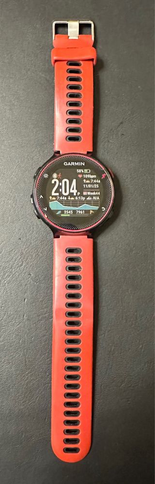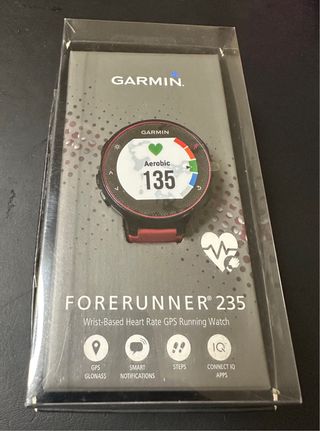 Reloj deportivo Garmin Forerunner 235 en color negro y rojo en buen estado. - GPS integrado. - Monitor de frecuencia cardíaca en la muñeca. - Notificaciones inteligentes. - Seguimiento de pasos. La batería está en muy buen estado (en carga completa marca 98% y dura 8 días con uso normal). La pantalla está como nueva (siempre con protector de pantalla). Incluyo lo mostrado en las fotos: - Reloj. - Caja original. - Cargador original (cable). - 3 correas en total con herramientas. - 1 protector de pantalla.