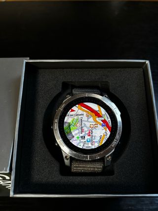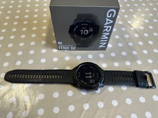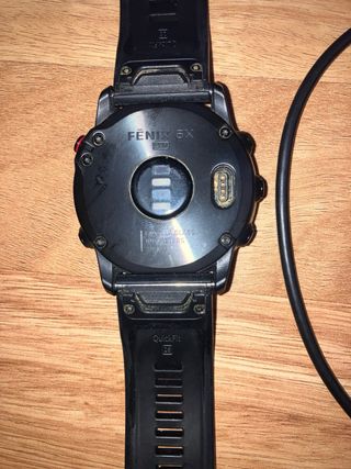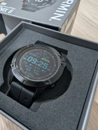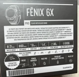 Reloj GPS Garmin Fenix 6X Pro en color negro. Un compañero ideal para tus aventuras. - Pantalla con altímetro y barómetro. - Monitor de ritmo cardíaco. - Indicador de batería. - Ninguna marca. - Incluye correa negra y caja originales.