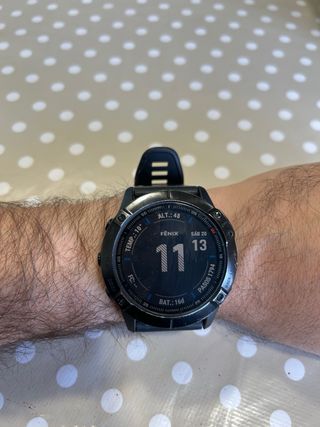 Reloj multideporte Garmin Fénix 6x Pro en color negro. Incluye cable de carga. - Diseño deportivo y resistente. - Correa de silicona negra. - Pantalla circular. - Seguimiento de rutas GPS - Carga fácil de trayectos para entrenos, carreras. - La batería como reloj dura más de una semana (depende de uso en deporte) - En modo “completo” llega a durar en una carrera unas 12 horas. Modo ultra he hecho ultra de 30 horas y sin problema.. dura mucho más. - Perfiles deportivos muy amplios