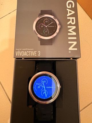 Reloj inteligente Garmin Vivoactive 3 con GPS. - Diseño elegante en negro y plateado. - Listo para Garmin Pay. - Sin marcas ni rayas.