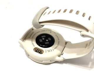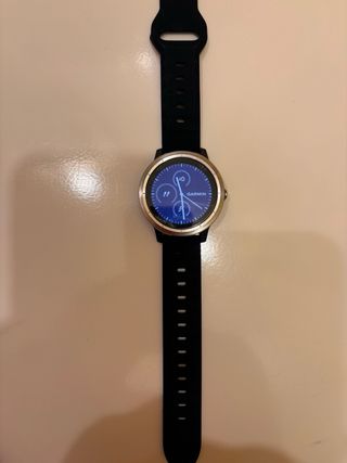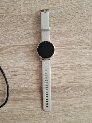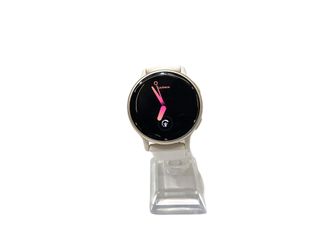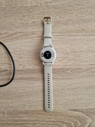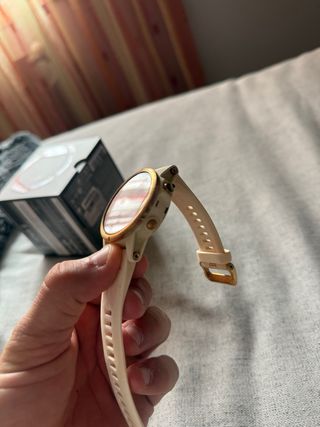 Reloj inteligente Garmin Venu 2S con GPS. Diseño elegante en tonos dorados y beige. - Pantalla circular. - Correa de silicona con cierre de hebilla. - Múltiples orificios para ajuste personalizado. La correa presenta algunos desperfectos. La correa no tiene nada que ver con el reloj en si, se puede cambiar por otra correa de otro color o el mismo, sin problema. Aún asi, la correa no presenta problemas a la hora de ponerse en la muñeca.