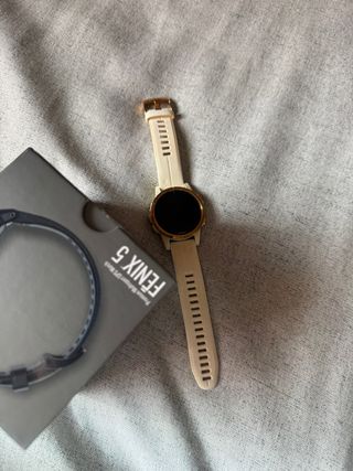Reloj GPS Garmin Fenix 5 con correa color crema y bisel dorado. - Pantalla circular. - Correa de silicona. - Cierre de hebilla. El boton de bajar a veces falla, pero aun asi se puede acceder a todas las funciones, va perfecto