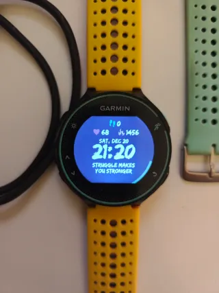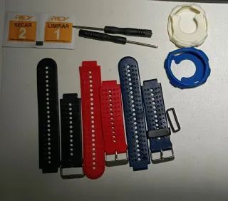 Reloj deportivo Garmin Forerunner 235 con GPS. Incluye correas intercambiables y cable de carga originales. Reloj en perfectas condiciones, muy bien cuidado. Funciona a la perfección y la batería dura una semana si lo usas como reloj normal y 3/4 días con un uso normal para entrenar. - Correa principal amarilla con perforaciones. - Correa adicional verde menta con perforaciones. - Cable de carga USB. - Herramienta para cambio de correa.