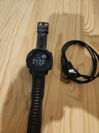Reloj deportivo Garmin Instinct en color negro. Siempre he sido muy contento con este reloj pero lo vendo porque he comprado uno con más funcionalidades. Está en buen estado físico y funciona perfectamente. Incluye cable de carga. Ideal para actividades outdoor, montaña, senderismo y entrenamiento. Funciones destacadas: GPS, altímetro, brújula, monitorización de actividad, resistencia militar, etc. Perfecto para quien busque un reloj resistente y fiable a un precio atractivo.