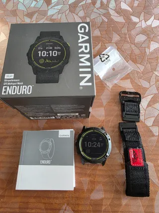 Ultimo precio. Listo para enviar. Reloj GPS Garmin Enduro Solar, diseñado para ultrarrendimiento y deportes multideporte. Incluye caja original y manual. Muy cuidado, desgaste habitual del uso, pero el bisel está casi intacto. + Correas: Original verde, una de nylon azul (velcro) como la que se ve en la imagen y 2 más normales, marrón y blanca. - Cargador de base, el original se me perdió. - Diseño robusto con detalles en amarillo. - Correa de tela negra. - Incluye caja y manual de usuario. IMPORTANTE: SOLO ENVIO, NO ENTREGO EN MANO POR MALAS EXPERIENCIAS. VENDEDOR SERIO, PUEDEN VER MIS VALORACIONES 🌟