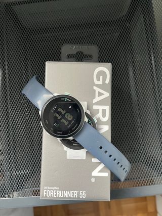 Reloj GPS Garmin Forerunner 55 en color blanco. La correa no es la original porque se me rompio. Tiene un par de rayoncitos, pero a nivel de prestaciones, sigue igual que el primer día. Hasta 2 semanas de batería.