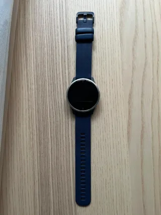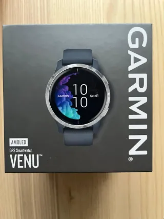 Smartwatch Garmin Venu en color azul granito/plata. Pantalla AMOLED. En perfecto estado, solamente presenta una marca en la pantalla, apenas perceptible. Se vende la correa original dañada por el uso, pero con otras dos como nuevas. La batería sigue en buen estado. Un smartwatch de uso diario y con grandes prestaciones para el deporte y entrenamiento diario.
