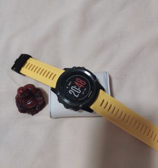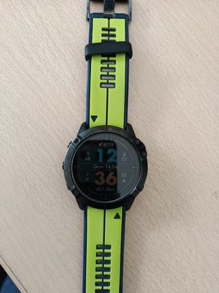 Reloj deportivo Garmin Fenix 6X PRO con correa de color amarillo y azul. - Pantalla circular. - Correa de silicona. - Bisel de metal. - Usado como reloj de diadio y unos 3 entrenamientos por semana. La batería está en perfectas condiciones unos 20 días por carga