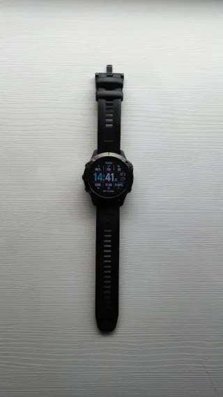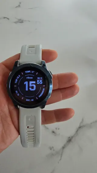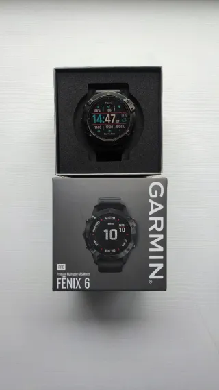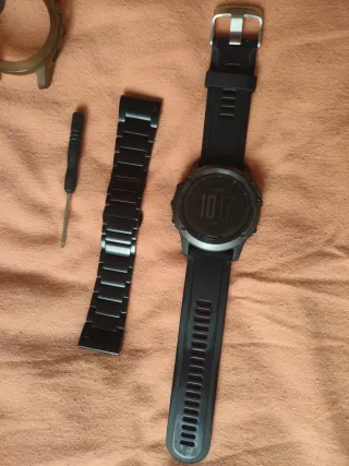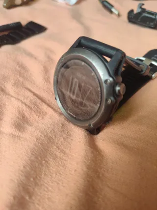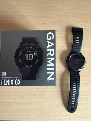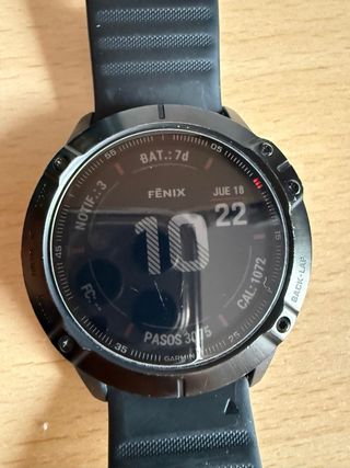 Reloj deportivo Garmin Fenix 6X Pro en color negro. Se vende por cambio a Fenix 8 El reloj funciona perfectamente, tiene algunos rasguños del uso que he intentado mostrar lo mas fielmente en las fotos ( los rasguños de la pantalla es el protector, la original NO TIENE NINGÚN RASGUÑO). La correa original tiene un eslabón roto que se muestra en fotos. Se se darían 3 correas mas no originales de color amarillo y naranja Con carga completa marca 21 dias de uso.