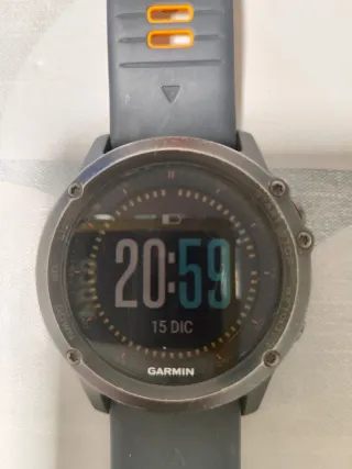 Reloj deportivo Garmin Fenix 3. Comprado nuevo en diciembre de 2016. Conservo factura, caja, todo. Ha estado parado desde 2019 y no parece que funcione. Tiene un picotazo en la esfera que se puede ver en la foto. Vendo para manitas o para piezas. Regalo un montón de correas de colores. no envío