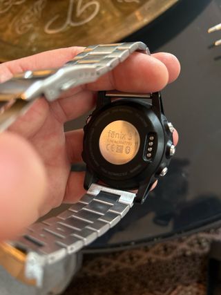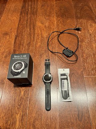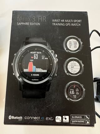 Garmin Fenix 3 HR Zafiro + Correa Titanio Se incluyen 3 protectores de goma. Cristal de Zafiro que no se raya Pulsómetro, GPS y conexión bluetooth con App móvil El reloj tiene muy pocas marcas de uso como se ve en las fotos y funciona perfectamente.