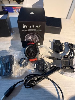 Reloj deportivo Garmin Fenix 3 HR con lente de zafiro. - Correa de silicona azul. - Correa de silicona verde. - Correa de silicona azul claro. - Herramientas para cambio de correa. _Tiene marcas en el bisel, pero la pantalla está intacta, es de shafiro, la batería dura muchísimo, sin GPS como 12/14 días.. Con GPS seguido unas 12 horas, y dos semanas si haces tres entrenos, a la semana de una hora, con cargador original. Tres correas de regalo, están usadas!
