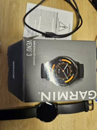 Smartwatch Garmin Venu 3 en color negro. Diseñado para salud y actividad física. Pantalla sin rasguños, en las fotos aparece pelusilla y no le hacen justicia. Acabo de subir la última foto con la esfera limpia. - Pantalla AMOLED en perfecto estado - GPS integrado. - Monitor de ritmo cardíaco. - ECG - mapas de terceros - Sensor elevate de última generación (fenix 8) - Posibilidad de hacer y recibir llamadas