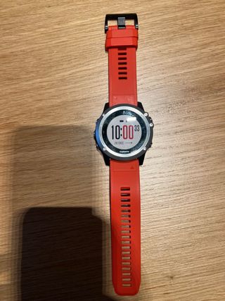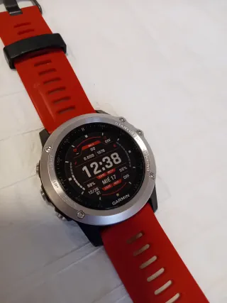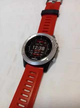 Reloj multideporte GPS con HR y edición zafiro. - Incluye caja original, con instrucciones - Cargador y accesorios. Dos cargadores, el original y otro réplica y transformador de carga sin estrenar. - Correa de color rojo. - Tiene leves rozaduras pero está en muy buen estado. - La batería aguanta más de 20 días con solo uso de reloj y tomando datos como HR, pasos. - Se le pueden instalar carátulas con la aplicación de Garmin.
