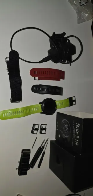 Reloj inteligente Garmin Fenix 3 HR con varios accesorios. - Caja original - Correa metálica negra - Correa de silicona verde. - Correa de silicona negra. - Correa de silicona roja. - Correa de Nylon negra. - Cargador.