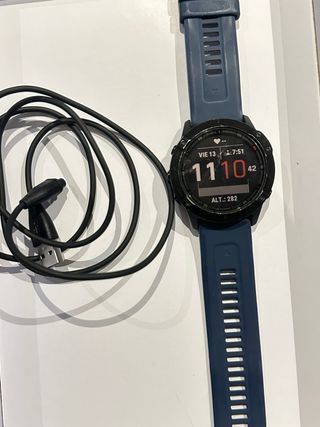 Reloj inteligente Garmin Fenix 6X Pro en color azul. En buen estado, funciona perfectamente. Incluye cargador y adaptador de carga - Pantalla circular. - Correa de silicona. - Incluye cable de carga.