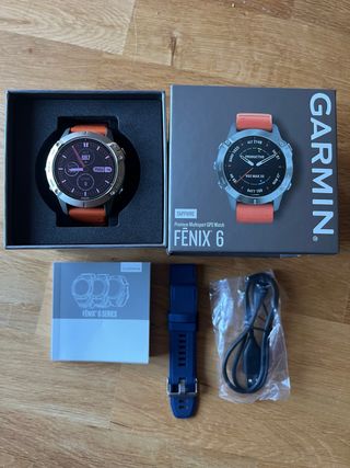 Reloj GPS multideporte Garmin Fénix 6X Pro. - Caja del reloj con diseño robusto. - Incluye manual de seguridad y guía de la serie Fénix 6. -Se regalan dos correas sin estrenar, una usada con una anilla de silicona rota . -Otra correa usada pero prácticamente nueva. -Una bolsita con 4 anillas de silicona nuevas a estrnar aunque no coincide el color con la correa que la tiene rota - El reloj lleva protector de pantalla. Lo ha llevado siempre y el cristal del reloj está impoluto.