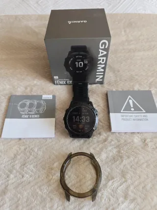 Reloj inteligente Garmin Fenix 6X Pro en color negro. Diseñado para actividades multideporte. Vendo mi Reloj con un solo Año de uso. Se le ha cambiado la batería por una nueva y original. Incluye cristal protector de la pantalla, carcasa protectora para evitar golpes/ arañazos y goma prectora para evitar que se meta agua y sudor en el conector de carga. Se encuentra en perfecto estado. Lo he cuidado y mimado. Funciona todo perfectamente no le falla nada.