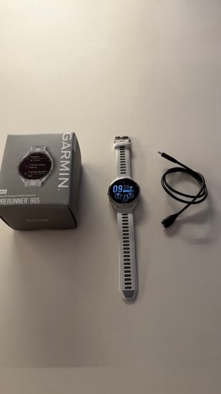 Reloj GPS Garmin Forerunner 965 en color blanco. Incluye caja y cable de carga. - Diseño elegante y deportivo. - Pantalla a color. - Correa de silicona cómoda.