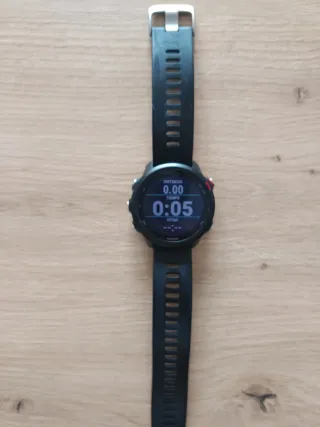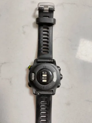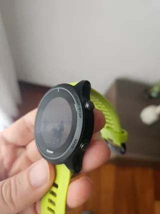 Reloj deportivo Garmin Forerunner 55 en color negro. Ha sido utilizado varios años, funciona bien pero la batería ya no tiene tanta capacidad, (dura dos o tres días). Me costó 140€. - Correa de silicona. - Hebilla de metal.