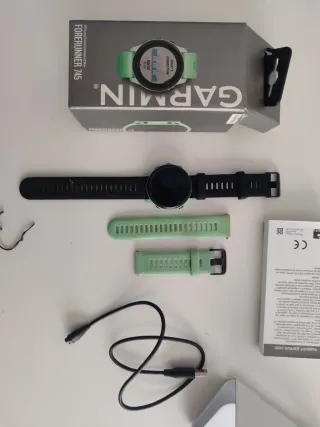 Reloj deportivo Garmin Forerunner 745 con correas intercambiables. - Correa negra original. - Correa verde adicional. - Bisel en color verde.