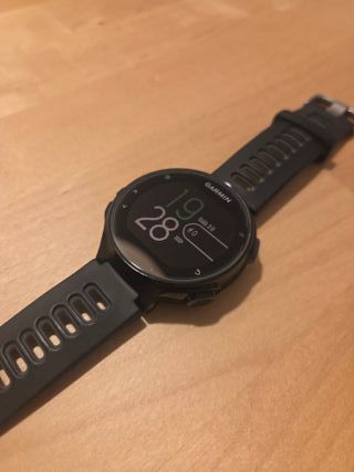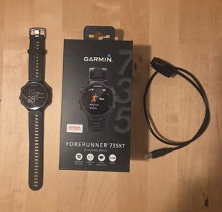 Reloj deportivo Garmin Forerunner 735XT en color negro. - Diseño ligero y cómodo. - Correa ajustable. Desde su primer uso tiene un cristal protector en la pantalla, por lo que le da un aspecto de estar como nuevo. Sin arañazos ni rozaduras. Se puede ver y supervisar sin problema.
