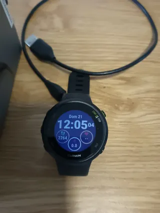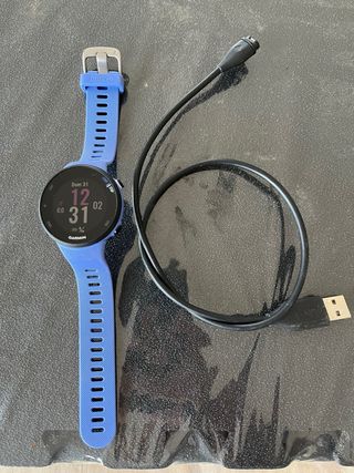 Reloj deportivo Garmin Forerunner 45S en color azul y negro. Incluye cable de carga. se ha usado muy poco esta casi como recien sacado de la caja , la bateria esta en perfecto estado