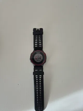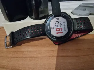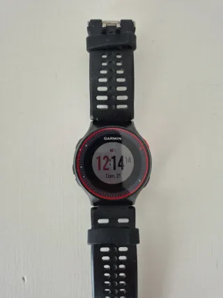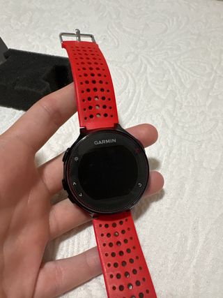 Reloj deportivo Garmin Forerunner 235 en color negro y rojo en buen estado. - GPS integrado. - Monitor de frecuencia cardíaca en la muñeca. - Notificaciones inteligentes. - Seguimiento de pasos. La batería está en muy buen estado (en carga completa marca 98% y dura 8 días con uso normal). La pantalla está como nueva (siempre con protector de pantalla). Incluyo lo mostrado en las fotos: - Reloj. - Caja original. - Cargador original (cable). - 3 correas en total con herramientas. - 1 protector de pantalla.