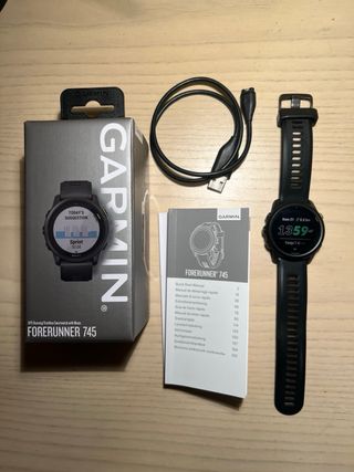 Reloj deportivo Garmin Forerunner 745 en color blanco en perfecto estado. Incluye cable de carga USB, manuales y embalaje original.