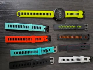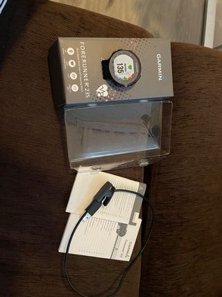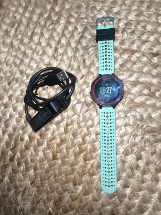 Reloj deportivo Garmin Forerunner 235 con GPS. Incluye correas intercambiables y cable de carga originales. Reloj en perfectas condiciones, muy bien cuidado. Funciona a la perfección y la batería dura una semana si lo usas como reloj normal y 3/4 días con un uso normal para entrenar. - Correa principal amarilla con perforaciones. - Correa adicional verde menta con perforaciones. - Cable de carga USB. - Herramienta para cambio de correa.