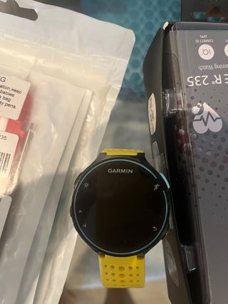Reloj deportivo Garmin Forerunner 235 en color negro. - Diseño deportivo y ligero. - Correa de silicona perforada. - Pantalla circular a color. Sin golpes ni roces. Lleva su protector puesto.