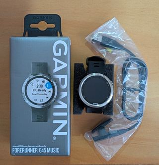 Reloj Garmin Forerunner 645 Music. - Caja y documentación originales. - Cable de carga y correa originales. - Desgaste superficial en el pasador de la correa e imperfecciones en la circunferencia del bisel apreciables en las fotos. - Sin problemas de carga, manejo o funcionamiento de los botones. - Pantalla sin desperfectos (siempre con protector).