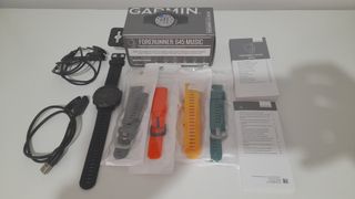 Reloj deportivo Garmin Forerunner 645 Music. Todo lo que se ve en las fotos, dos cargadores, el original y uno de repuesto, correa original negra sin uso, correas de regalo, caja original.