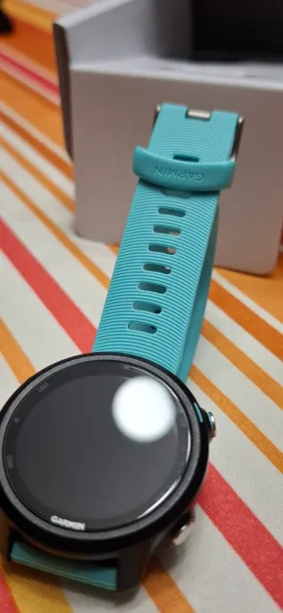 Reloj GPS en buen estado. Tiene una pequeña mancha en la pantalla. Píxeles muertos. Funciona perfectamente. Correa turquesa.