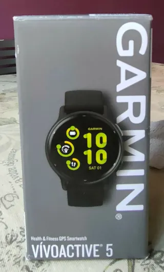 Reloj inteligente Garmin Vivoactive 5 en color negro y gris. - Pantalla táctil a color. - Monitor de actividad física. - Seguimiento de sueño. - 11 días de autonomía - Material de la correa: silicona - Material de la caja: aluminio - Resistente al agua - GPS integrado Totalmente nuevo, en su caja original, sin estrenar.