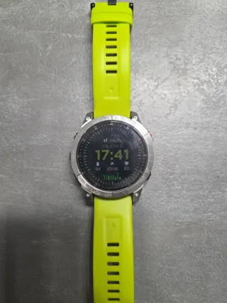 Reloj deportivo Garmin Fenix 5 con correa verde y bisel negro. Funciona perfectamente, tiene marcas de uso. El botón izquierdo cruje un poco al pulsarlo pero se usa sin problema, funciona sin problema, etc. En el momento de hacer la foto lleva encendido en reposo una semana y tiene aún un 81% de batería. Cargador y caja completa original con instrucciones y demás. - Múltiples deportes. - Pulsímetro en muñeca. - Pantalla de alta resolución. - Correa de silicona cómoda.