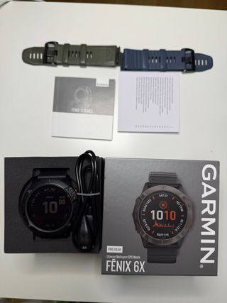 Reloj inteligente Garmin Fenix 6X Pro con GPS. Incluye correas adicionales. - Correa negra original. - Correa naranja. - Correa amarilla. - Correa blanca y azul. - Protector de pantalla CAVN. - Caja original Garmin.